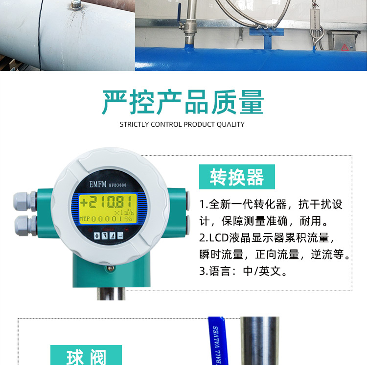 5. 智能顯示與輸出:配備LCD液晶顯示器,支持中英文界面,實時顯示瞬時流量、累計流量及報警信息;輸出4~20mA、0~5kHz及RS485通訊信號。