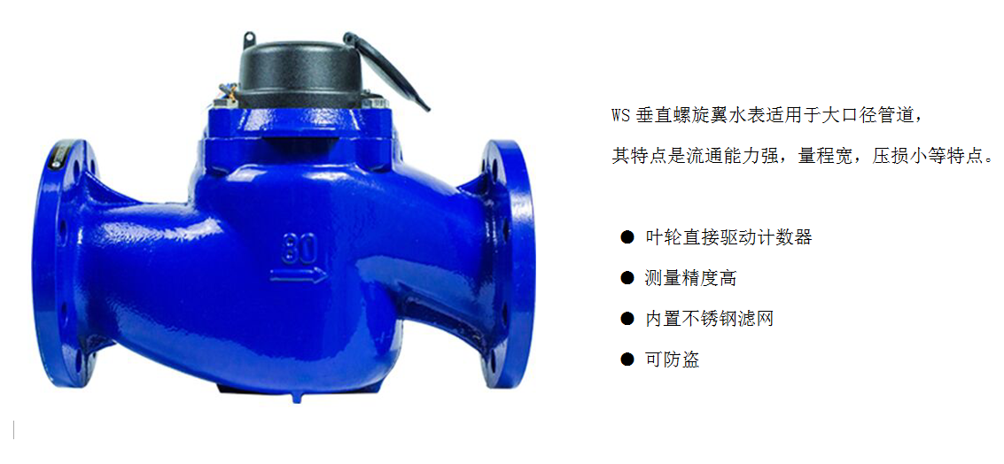 WS垂直螺翼式水表,垂直螺翼式水表,無蝸桿齒輪傳動結(jié)構(gòu),葉輪直接驅(qū)動計(jì)數(shù)器,傳動效率高,始動流量低。