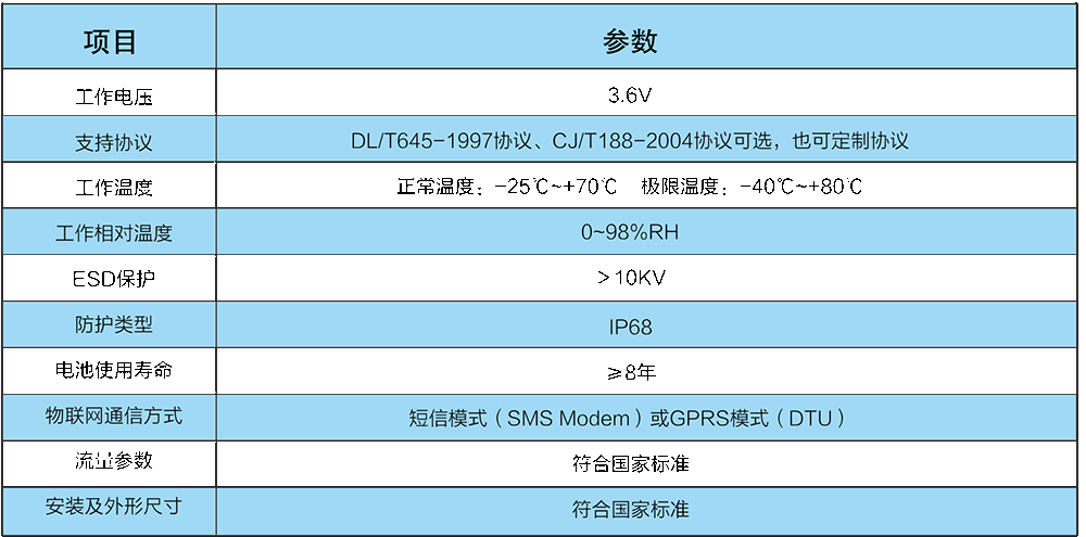 本IP水表,符合GB/T778-2007《封閉滿管道中水流量的測量 飲用冷水水表和熱水水表》和CJ/T224-2012《電子遠傳水表》的技術要求。通信規約遵循CJ/T188-2004《戶用計量儀表數據傳輸技術條件》的要求,也可根據用戶需求定制通信協議。